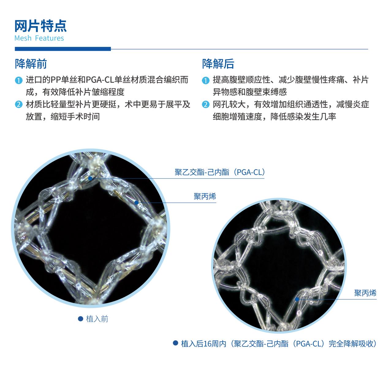 康蒂娜部分可吸收疝修補(bǔ)片由不可吸收的聚丙烯單絲和可吸收的聚乙交酯-己內(nèi)酯(PGA-CL)單絲編織而成??晌詹牧显谝欢〞r(shí)間內(nèi)被組織吸收,有效減少補(bǔ)片皺縮、患者術(shù)后疼痛以及異物感的發(fā)生。